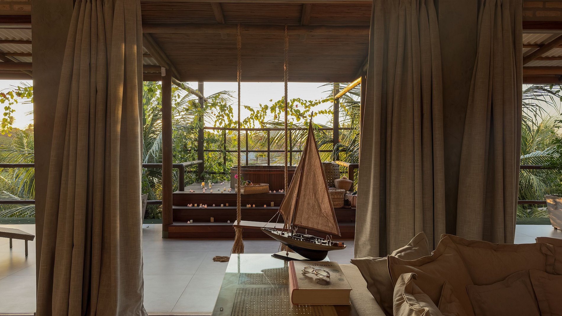 El amplio balcón de 70 m² con vistas a la laguna y al muelle invita al placer: hamacas, chaise longues, love seat, columpio y un jacuzzi privado transforman este espacio en un verdadero oasis al aire libre.