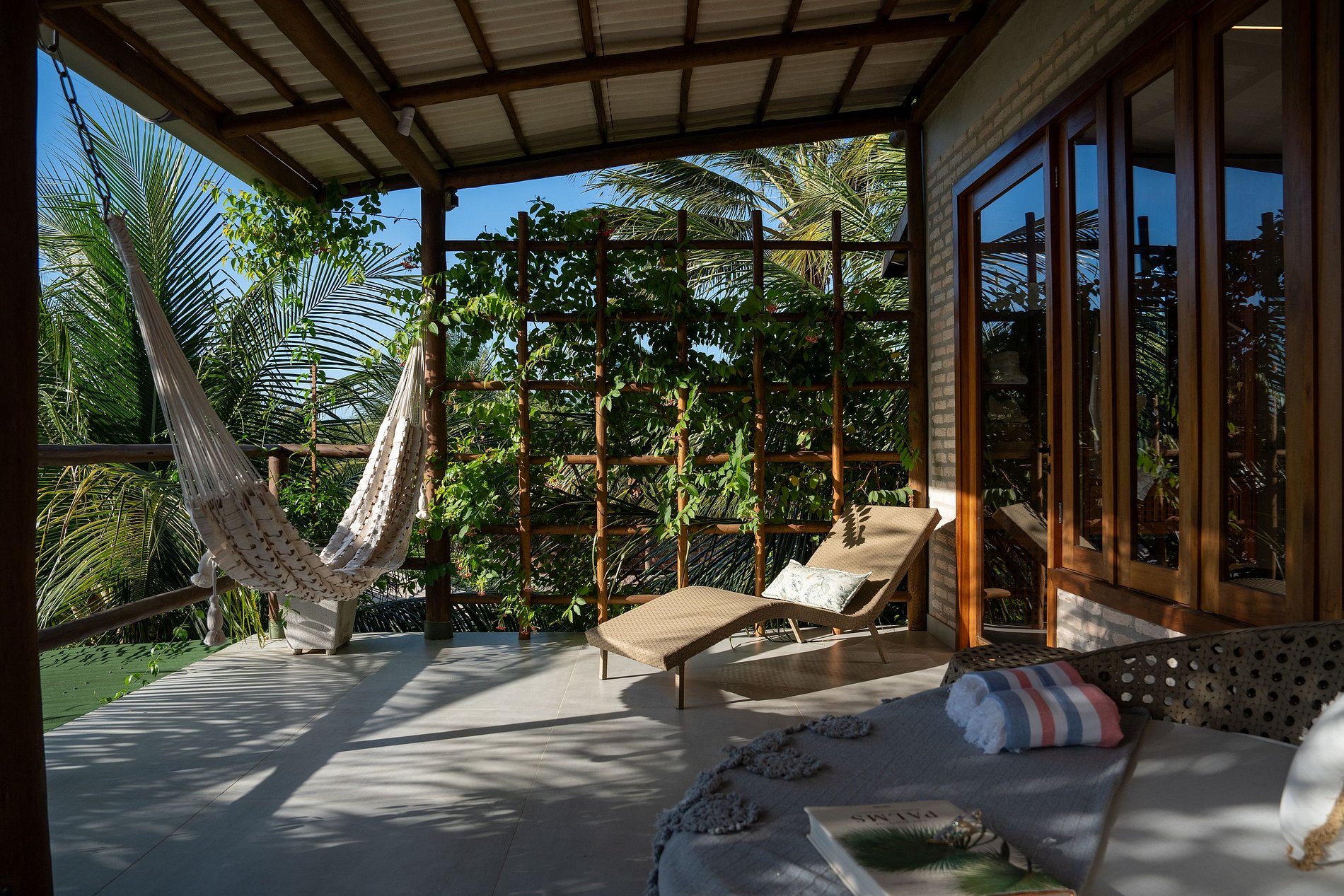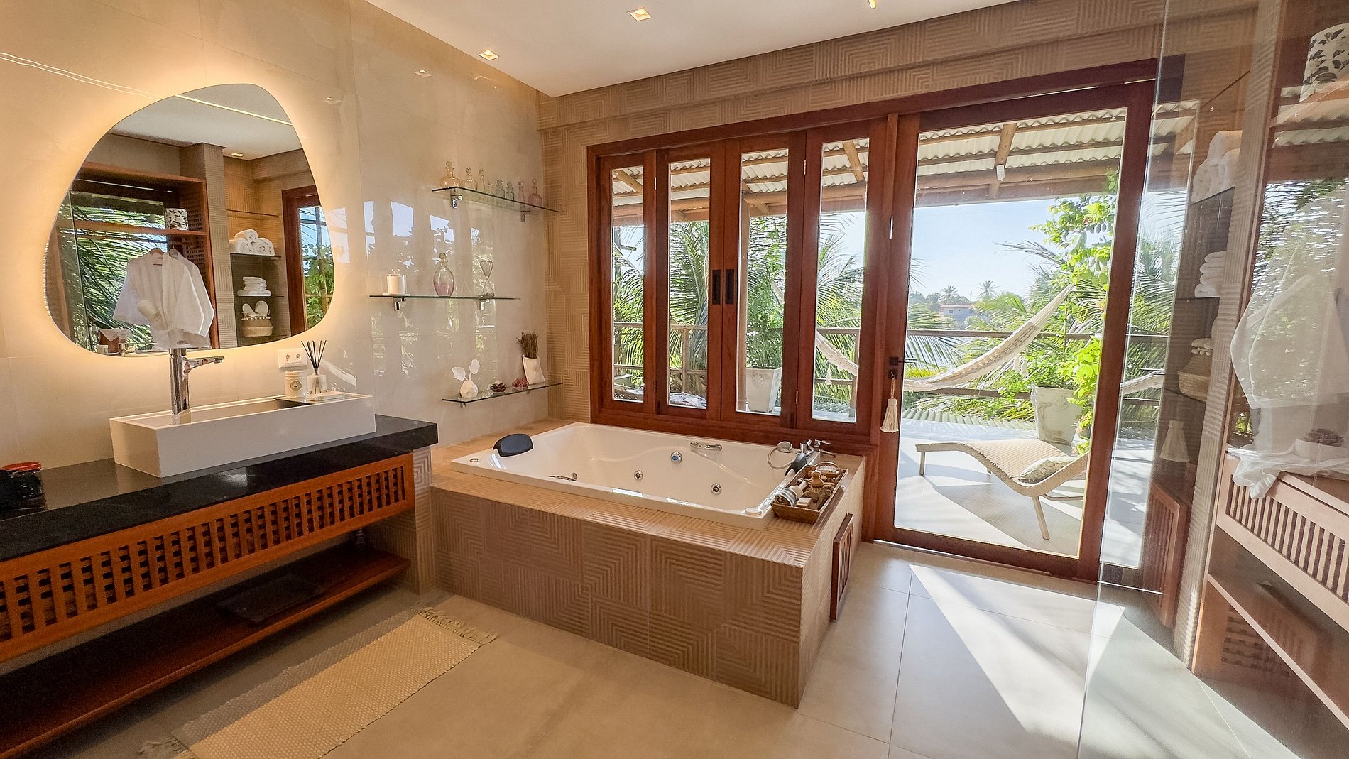 Le grand balcon de 70 m² avec vue sur le lagon et la jetée est une invitation au plaisir : hamacs, chaises longues, causeuse, balancelle et jacuzzi privatif transforment cet espace en une véritable oasis de plein air.