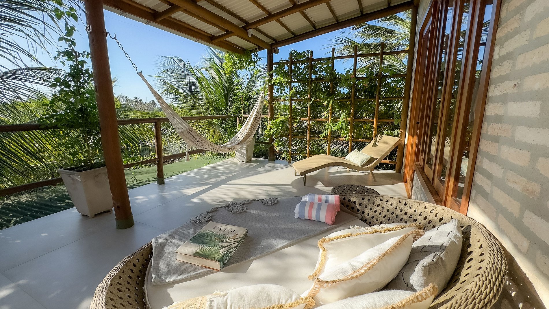 A ampla varanda de 70m² com vista para a lagoa e o píer é um convite ao prazer: redes, chaises longues, namoradeira, balanço e um ofurô privativo transformam esse ambiente em um verdadeiro oásis ao ar livre.
