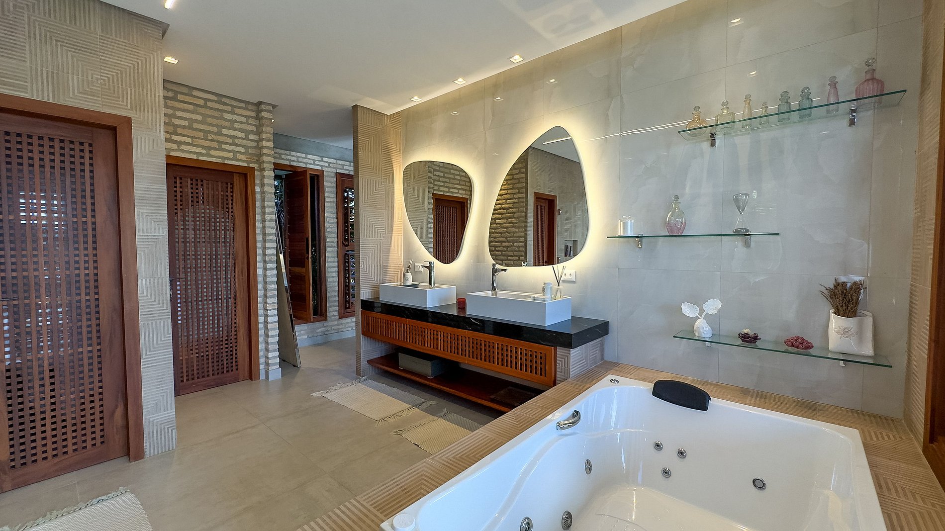 • Sala de banho com 16m²: hidromassagem dupla, cromoterapia, duchas duplas e bancada com duas pias