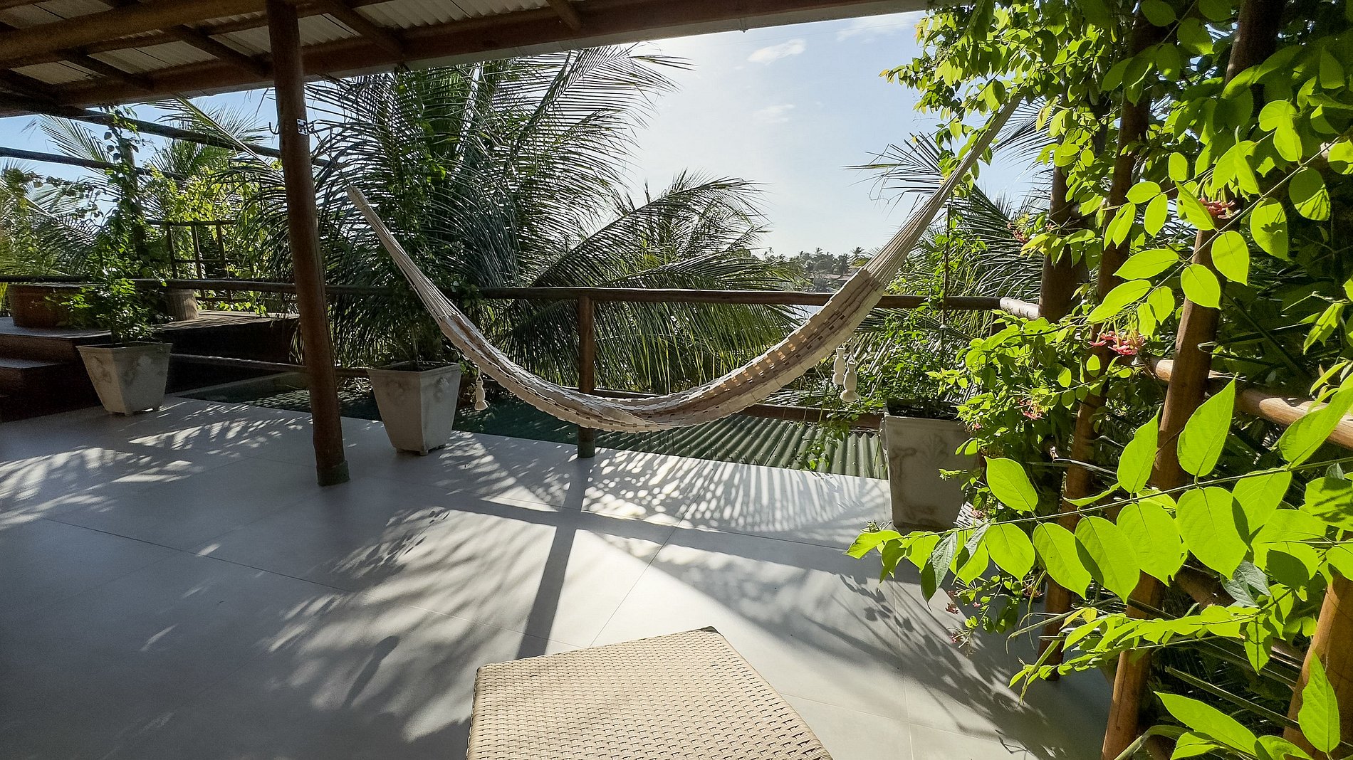 A ampla varanda de 70m² com vista para a lagoa e o píer é um convite ao prazer: redes, chaises longues, namoradeira, balanço e um ofurô privativo transformam esse ambiente em um verdadeiro oásis ao ar livre.